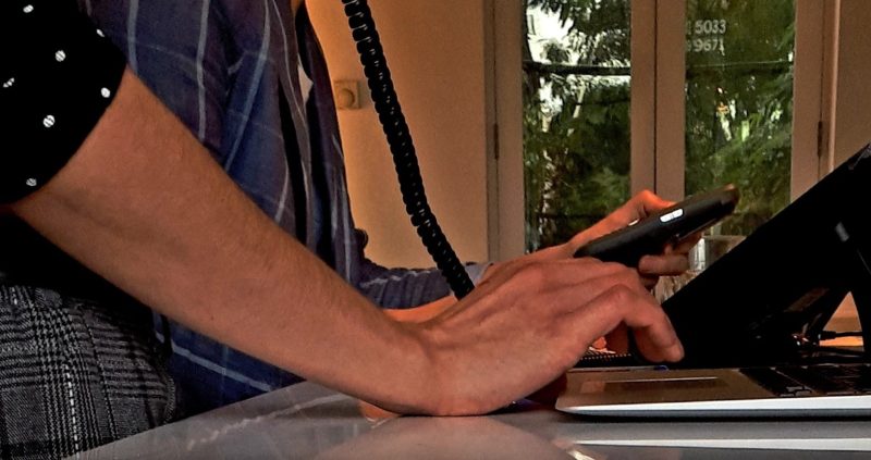 Sit-stand desks may help some conditions but it is always important to be aware of how you are using yourself while you work. This young woman was standing, but constantly had her wrist contracted whilst typing. This misuse is likely to irritate her median nerve and may well develop into RSI if she continues with this habit.