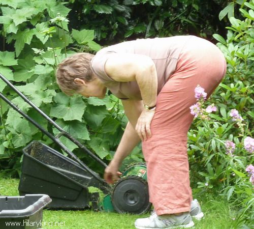 When you need to bend, be aware of your movements and hinge forwards freely from your hip joints, adapting the monkey position as the woman in this (un-posed) photo is doing (although ideally the movement is made without a hand on the knee) and you will be more likely to avoid the back pain that so often happens after spending hours bending, mowing and digging.
